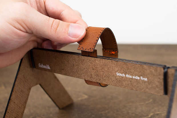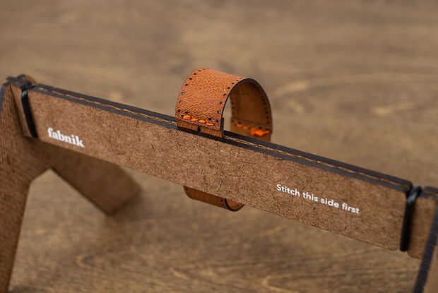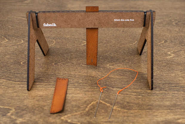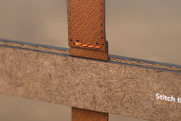 Enhebrar las agujas en uno de los pocos hilos del paso anterior y coloque la pieza de cuero más larga restante verticalmente en el Pony de costura. Siga los pasos 6-11 en la primera costura, luego vuelva a colocar las piezas y llevar el otro extremo alrededor y realizar los mismos pasos en esa costura. Se creará un bucle, con el lado liso hacia fuera.
