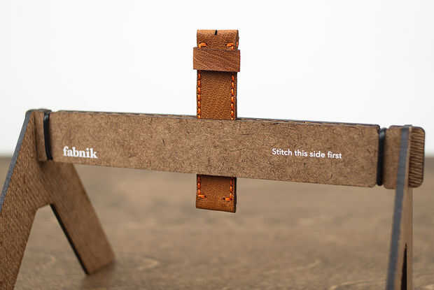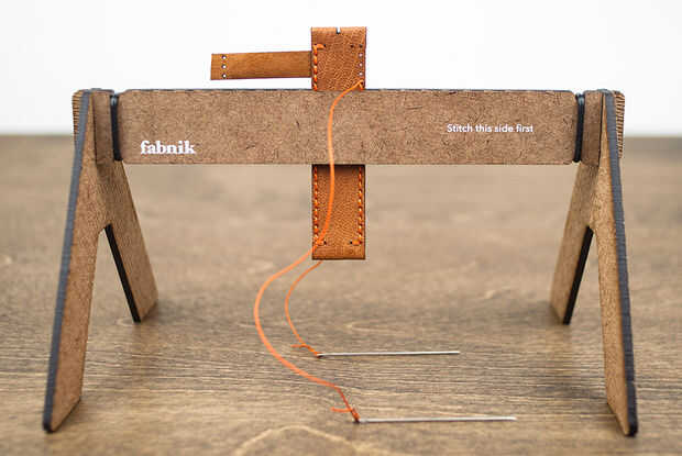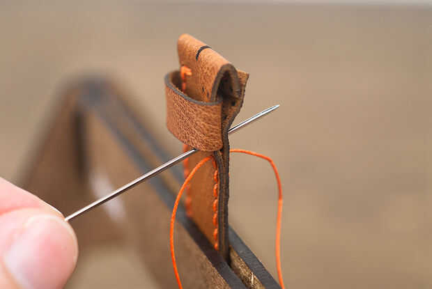 Gire la banda superior de modo que se sienta verticalmente en el potro. Ahora el lazo sobre la breve pieza, coser en la costura de segunda de la banda de la parte superior, así. Tarda algunos costura cuidadosa el consigue a través de todas las tres piezas de cuero. Terminar la costura con un nudo cuadrado oculto como antes.