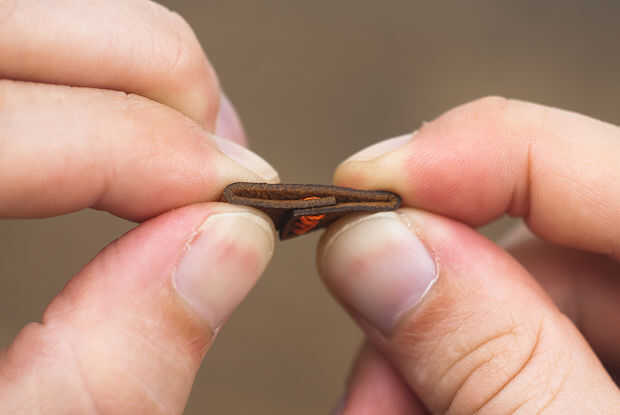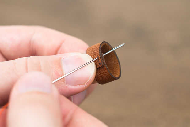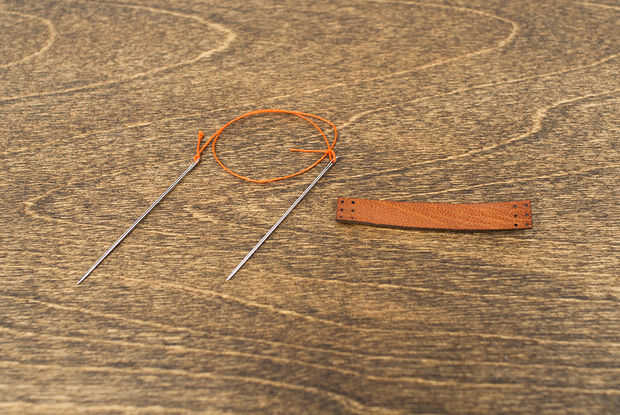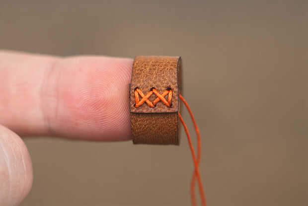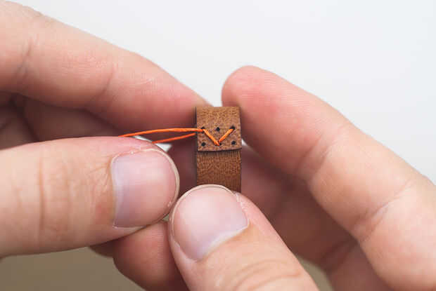 Enrosque el pedazo corto de hilo colocado a un lado en el paso 4 en las agujas. Tome el pedazo restante corta de cuero y coser un patrón de zig-zag los lazos de conexión. Terminar con un pespunte y nudo cuadrado como lo hizo primero en pasos 10 y 11. Luego apriete el lazo con la costura en el centro.