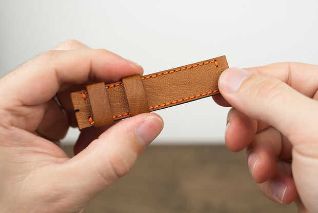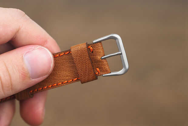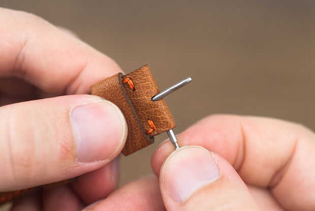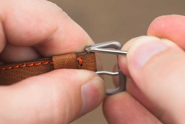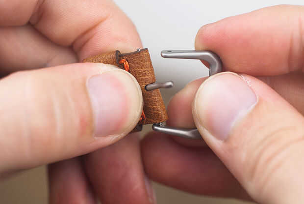 En primer lugar, deslice el encargado de la correa en la banda superior. Luego inserte el pasador de la hebilla en el extremo de la correa y deslice la barra de resorte de la correa y hebilla de clavija. Asegure la hebilla en su lugar con la herramienta de reemplazo de barra de resorte.
