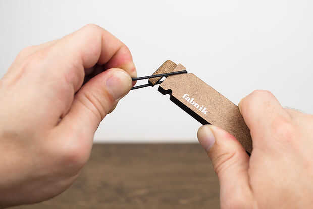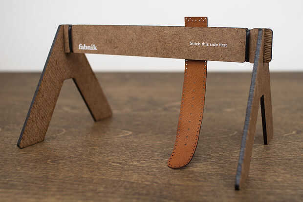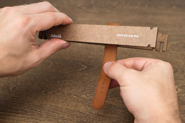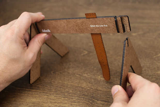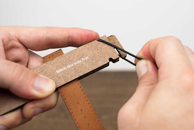Luego estirar las barras abiertas e Inserte la pieza de cuero más larga en medio de las dos barras. La parte superior los agujeros de costura debe ser aproximadamente 1/4" sobre la parte superior de las barras. Sujetan a las barras y colocar la segunda banda de caucho. Ahora coloque las barras en las muescas sobre las costura piernas de pony.