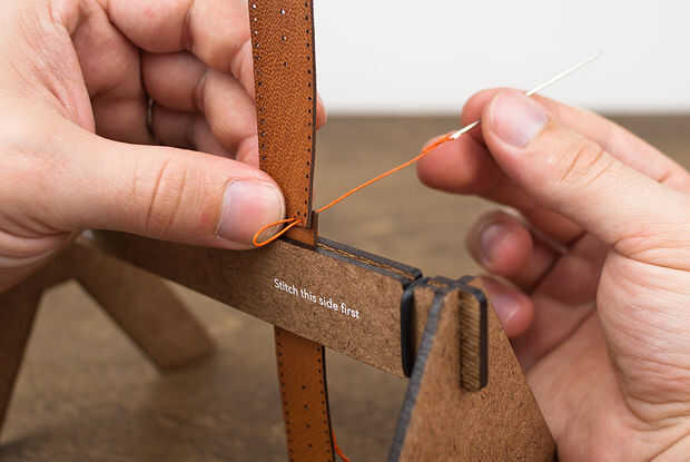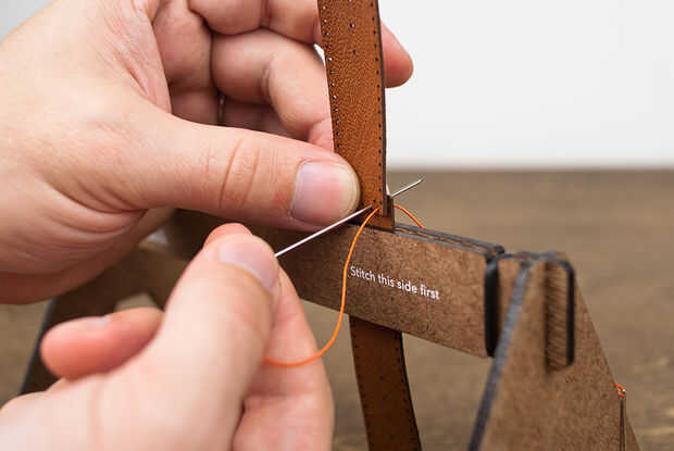 Uno de los bares de pony costura debe etiquetarse "coser este lado primero". Inserte la aguja en el segundo agujero de ese lado y tire de ella a través de todo el camino. Comenzarás en este lado para cada puntada, que creará una costura de aspecto agradable y consistente. La etiqueta ayuda a si pierde la pista.