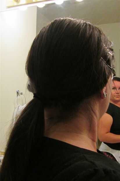 El pelo se tira hacia atrás en una cola baja y traté de conseguir mi pelo para hacer el pequeño capítulo suelto a los lados de la cara pero mi corte de pelo personal no permite que esto ocurra.