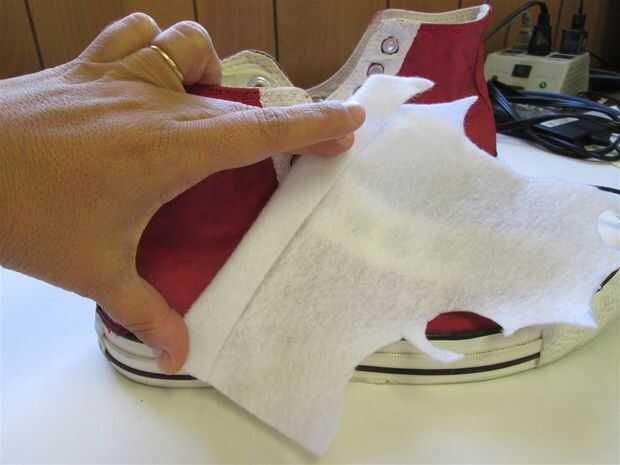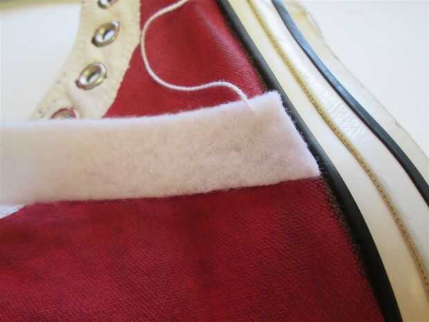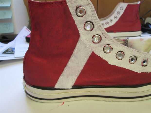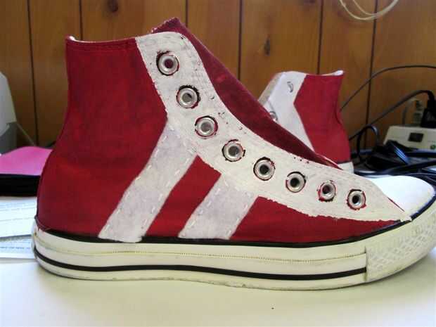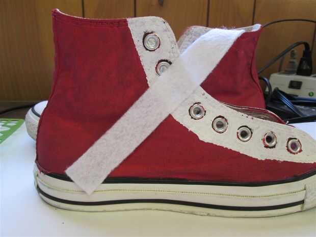 Hay dos rayas en la parte exterior y dos rayas en el interior de sus zapatos. No quería meterse con el símbolo de Converse, así que sólo añadido tiras de fieltro en el exterior de los zapatos.