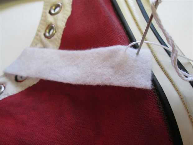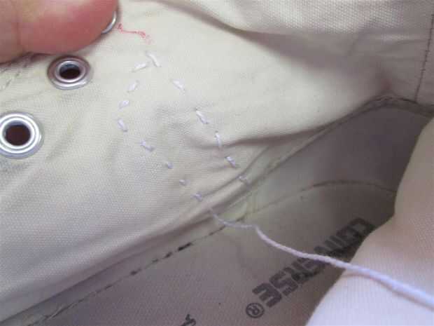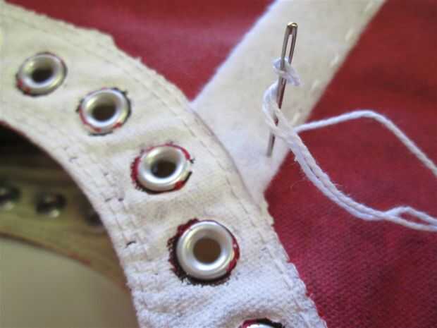 Tomé una aguja de hilo y bordado bordado blanco y mano coser el fieltros rayas a los lados de los zapatos.