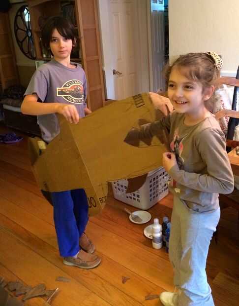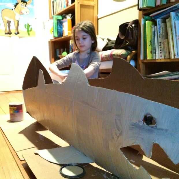 Nos gusta hacer disfraces en casa. Si una caja llega a nuestra casa se reclama inmediatamente por uno de mis hijos. Aquí está mi hija hacer un disfraz de tiburón que puede correr alrededor de la casa devorando a otros.