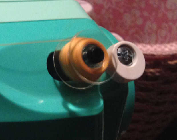 2. enganche el hilo en el tensor de bobina de bobina, páselo por el orificio superior de la canilla (lado usted está sosteniendo, es) y empuje la canilla en la devanadera de la bobina. Empuje la devanadera de la bobina hacia la derecha, desde la posición de la costura en la posición de la bobina.