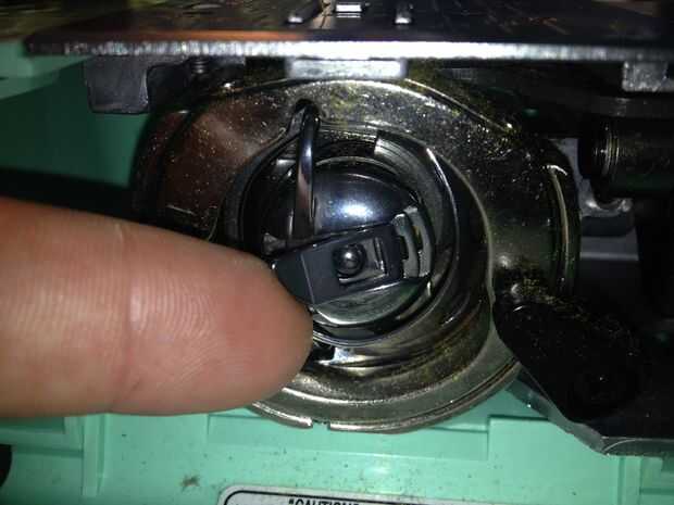 1. Tire de la palanca pequeña en el soporte de la bobina hacia fuera y retirarlo del compartimento de la canilla.