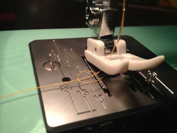 5. suavemente gire la rueda manual hacia usted. Reloj como la aguja pasa por debajo de la placa de la aguja y el hilo es cosechado para arriba y lazo en el portabobinas. Se debe barrer el hilo de la bobina y traerlo en un lazo hacia arriba por encima de la placa de aguja.