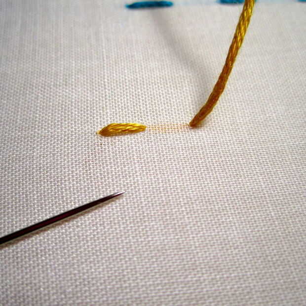 Lleve la aguja a través de la parte posterior o reverso de la tela hasta que el nudo. Tomar una pequeña puntada hacia la derecha o izquierda. Cuando la aguja va hacia atrás a través del al revés, te ser traerlo para arriba a través de la puntada de una tela de la última puntada. Luego se empuje la aguja a través de la tela junto al final de la primera puntada.
