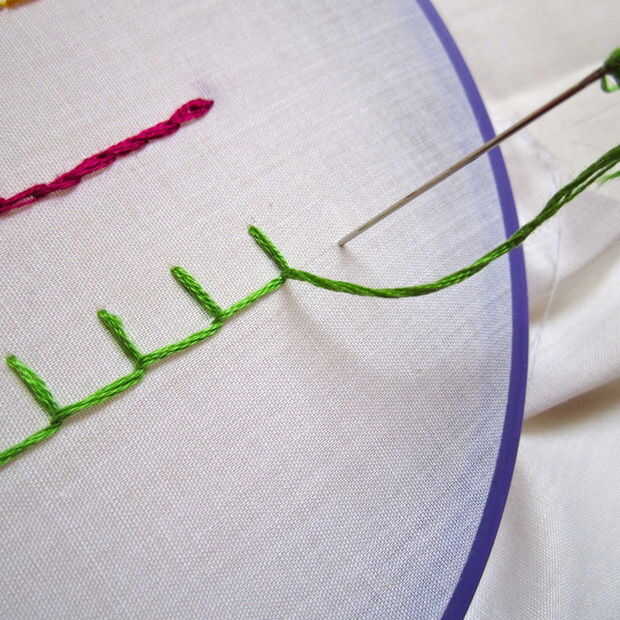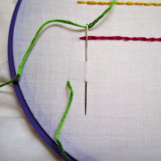 - Inserte la aguja donde quieras la parte inferior de la puntada de manta y tire hacia arriba a través de la tela.