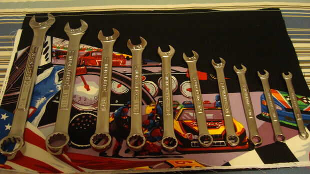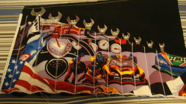 Coloque la pieza lateral de llave a la derecha de la tabla hacia arriba.  Coloque la bolsa encima de él se alineaba en el borde inferior y el pin en su lugar.  Coser el bolsillo a la parte posterior del caso de costura en los extremos para asegurar el hilo y principio.  Marca las costuras de los bolsillos de la llave y coser uno a uno, asegurándose de que cada llave encaja correctamente en el bolsillo antes de coser el siguiente tamaño de llave. Hacer varios pasa sobre cada puntada a enforse doble.  No es necesario coser porque no están cortando los hilos después de cada pasada.  Se gire en los extremos, girando y coser sobre el punto que acaba de hacer.  Cosí este caso con hilo blanco para que puedas ver la costura mejor.  Ponga a un lado.