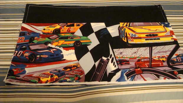 Coloque la herramienta lado caso pieza derecha arriba y luego colocar el bolsillo (tela impresa) sobre el forro superior con el borde inferior. Coser los lados detrás de costura en los extremos de las costuras y principio.