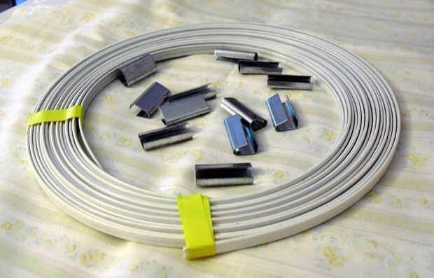 Necesitarás a algún tipo de resorte aro acero deshuesado. Hay varias clases, pero tienden a usar una variedad de resistencia media que consiste en dos bandas de acero revestido en plástico. Usted puede encontrar en corsetmaking.com. Tienen otro tipo que es similar, sólo cubierto de bocací, pero creo que el plástico es más fácil de cortar y es un poco más fuerte que la materia bocací. Sé que Farthingales tiene deshuesado de acero del resorte de deber más pesado, pero nunca lo he utilizado así que no puedo decir mucho al respecto. Usted puede averiguar cuánto necesitarás sumando todas las mediciones de circunferencia que vino para arriba con en que tus aros (añadir un extra 1" para cada aro permitir la superposición). Para mi disgusto, corsetmaking.com no lleva conectores de aro, así que compré mis en persona en Lacis.