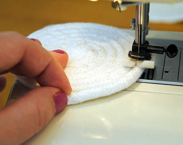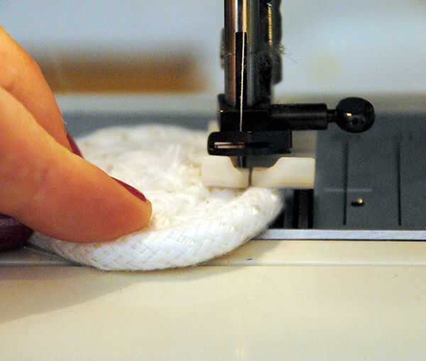 Empieza en el centro de la espiral, alinee el pie prensatelas por lo que es en medio de dos filas de cuerda y puntada zig-zag (captura ambos lados) mientras gira la bobina. Hacerlo muy lentamente para empezar y no se olvide de mantener los dedos fuera del camino!