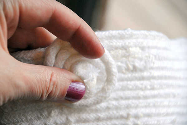 Con la última parte de la cuerda (por grande que gustaría hacer tu espiral-usé unas 6 pulgadas), hacer un espiral en el lado de la taza. Sostiene contra el tazón de fuente, usted será coser a través de él como hiciste en el paso 3, para mantenerlo en su lugar. Entonces zigzag puntada alrededor de la espiral (lentamente). Esta parte puede ser un poco complicada, pero he encontrado que si aplasta el tazón de fuente, yo puedo maniobrarlo bastante bien, hasta que la espiral esté bien asegurada.