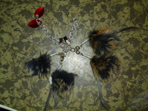 Básicamente la misma técnica como en ible de la garra. Pegué suma fakefur a la hoja de los titulares, poner resortes de tensión a cada extremo de la hoja y 2 x 2 conectado a un anillo, luego tomé otro anillo y envuelven con los anillos más pequeños que tengo, es simplemente de 2 en 2 y adjunta los anillos grandes que sostenga las hojas en el otro extremo pongo flor cadenas y cocodrilo abrocha para unir a la sleaves canino y una carabina en un extremo para cerrar alrededor de las muñecas y la suma agregada de rojo brillante escalas.