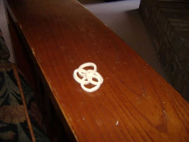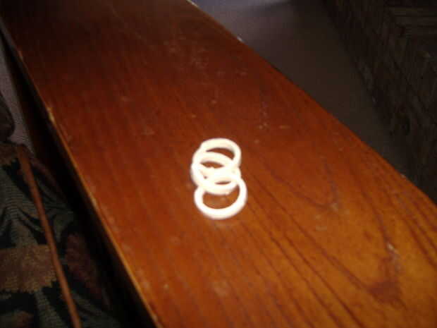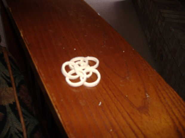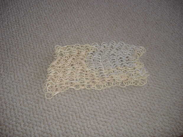 Empezar por poner dos anillos en uno como se muestra. Luego agregar otro entre ellos, superpuestos en el primero de ellos. Después dos en eso anillo de superposición de los dos primeros y continuar ese patrón hasta llegar a una cadena, probablemente sobre un pie de largo. Luego agregue más filas bajando hasta cualquier tamaño de hoja que desee.