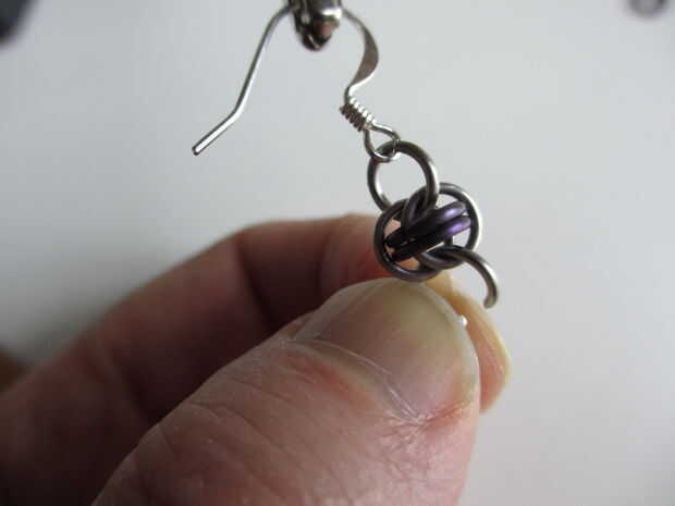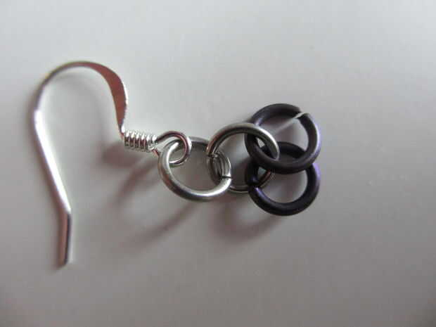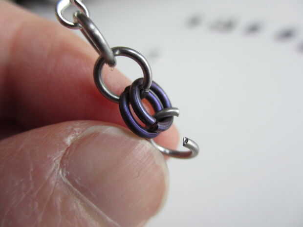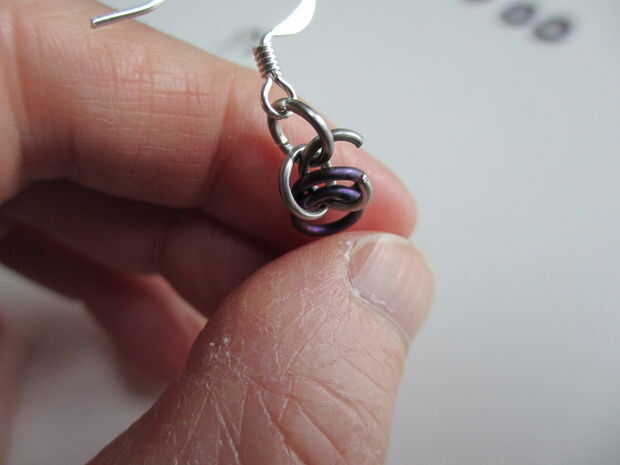 Ahora, poner otro anillo abierto por los dos anillos cerrados. Doblar hacia atrás en la cadena y gancho a través del primer anillo - que se une al gancho de pendiente. (Mira las fotos si esto no tiene sentido).