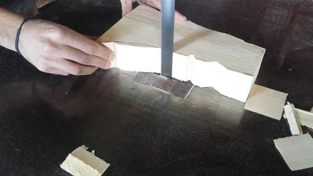 Encontré un trozo de madera en mi taller y comenzó shapping que se vea como una roca. La forma y dimensiones no importa porque una roca no tiene cierta forma. Simplemente tome un pedazo de madera y con un archivo o una escofina lo áspero para arriba.