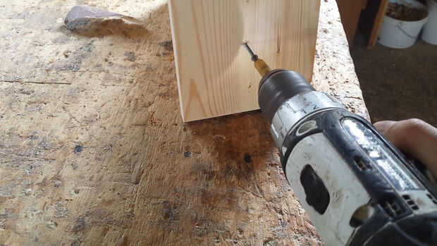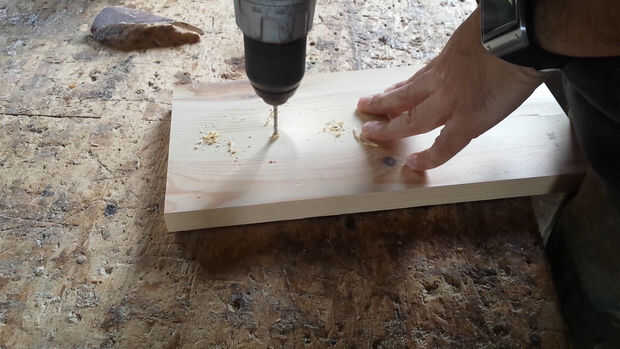 Ahora necesitamos un trozo de madera para sujetar todos los componentes de nuestro comedero. He utilizado un trozo de madera de 31 x 15cm, piloto tres orificios en ella como se muestra en las imágenes, aplicación pegamento y colocaron la roca en. También usé tres tornillos de 5cm para asegurar la base en el lugar.