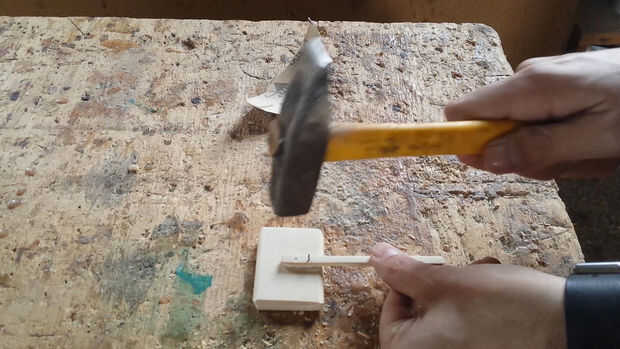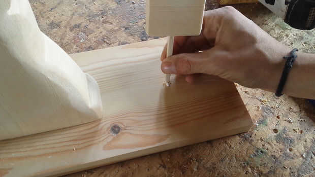 Perforar algunos agujeros en el post de las uñas y asegurado en la muestra con algun pegamento y dos clavos.
