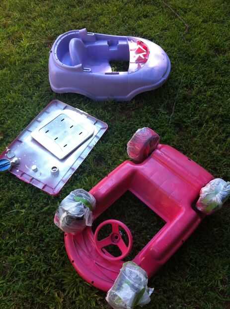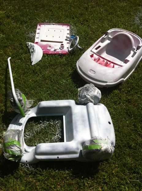 Fue mi primera experiencia usando pintura en aerosol y estaba tan emocionada lo fácil que era. Con mi asistente poco a mi lado en sus gafas de seguridad, presentado las partes y rociado en la cartilla. Después de que la cartilla fuera seco pintamos el resto de las piezas en color rosa o púrpura.