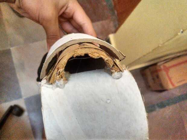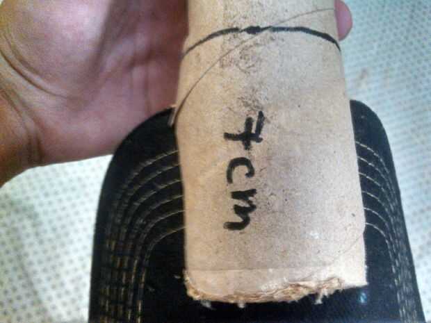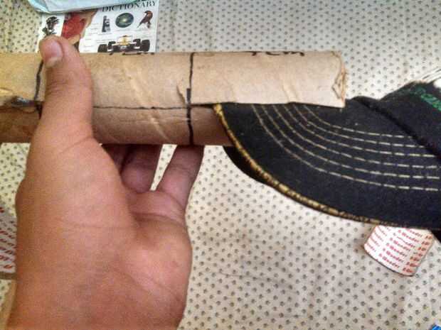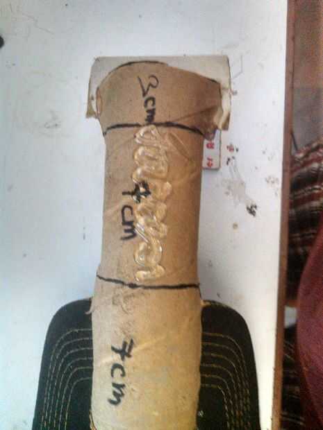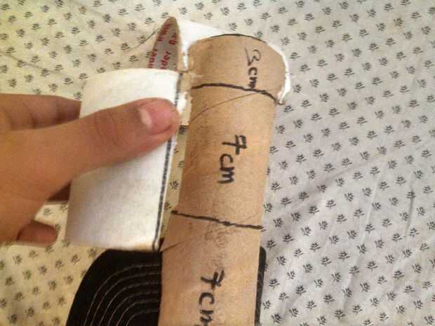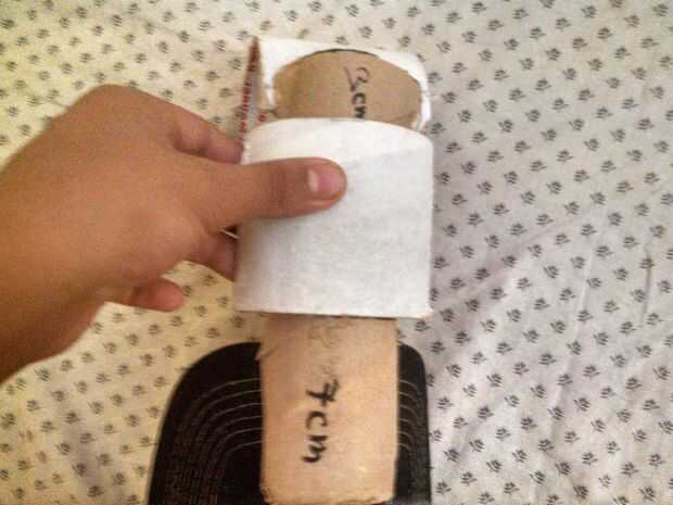 ahora tomar el lado de 7 cm del tubo e introducir la aleta de la tapa dentro de la corte en el tubo de cartón en la parte s de 7 cm. como se muestra above.after que termines gota de pegamento en el segundo (medio) 7 cm piece.at último tomar la izquierda más pequeña pieza de la cinta del rodillo y coloque sobre el pegamento para pegar allí...