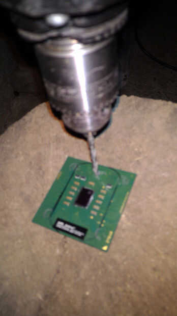 En el paso anterior, se alisó su CPU. Ahora toma y coloque sobre una superficie lisa. Traer el taladro y fijar la broca (en la primera prueba, si su bit pasa a través del agujero del collar de su modelo de dogtag) y utilice la velocidad más baja. Si la velocidad no es configurable, considere tomar un descanso durante la perforación. Le ayudará a evitar la ruptura de su cpu.