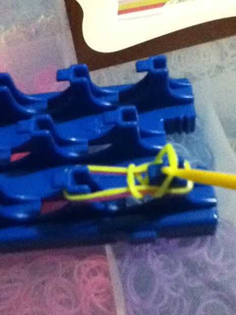 Paso 1: materiales!!! Telar o los dedos o una herramienta, gancho, bandas, clipPaso 2: 1 banda Colocar una banda en una x en la herramientaPaso 3: siguiente Lugar 2 bandas más en la herramientaPaso 4: bucle! Agarrar la banda inferior y coloque encima