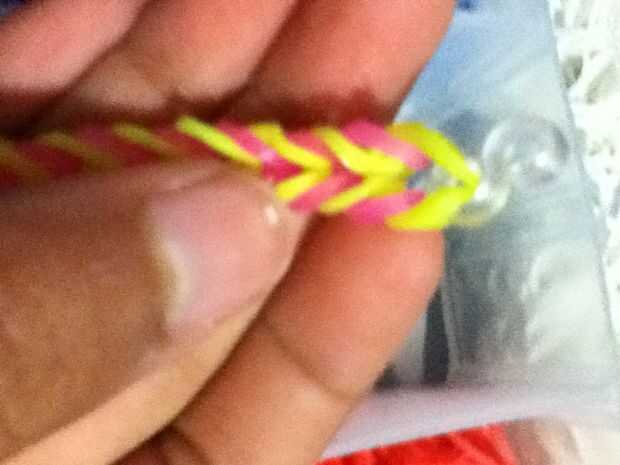 manera fácil de hacer una pulsera de cola de pescado en cualquier lugar.Paso 1: materiales Todo lo que necesitas esSu elección de colores de gomasy un clip C o SPaso 2: Poner la primera banda de goma de color en una figura de ocho en los dos dedos. P