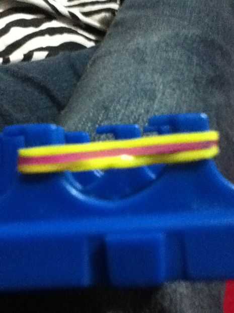 Paso 1: materiales!!! Telar o los dedos o una herramienta, gancho, bandas, clipPaso 2: 1 banda Colocar una banda en una x en la herramientaPaso 3: siguiente Lugar 2 bandas más en la herramientaPaso 4: bucle! Agarrar la banda inferior y coloque encima