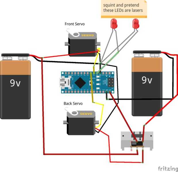 El cableado es muy simple. Conectar una fuente de alimentación a los dos servos, conectar los cables de señal del servo con Arduino, conecte el láser a la Arduino y finalmente conectar otra fuente de energía para el Arduino. Dejar oportunidades para agregar componentes adicionales tales como sensores.
