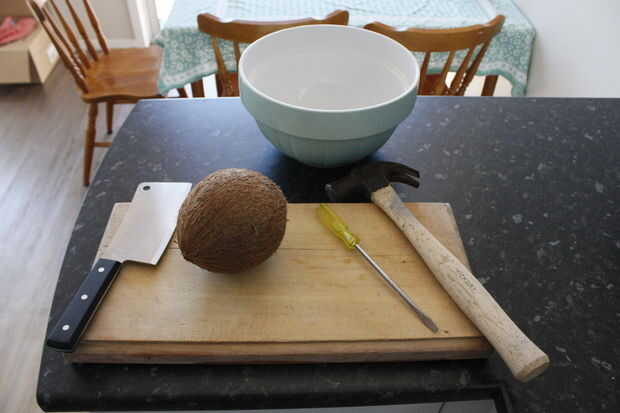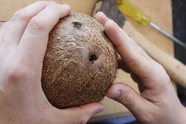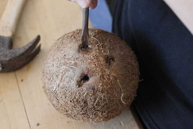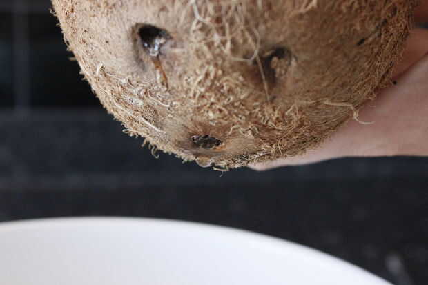 Para hacer compra de cocos frescos que vale la pena que no me gusta entrar cada poco puedo hacia fuera de ellos. Esto significa tomar el tiempo adicional para golpear pequeños agujeros en dos de los cocos "ojos" por lo que puedo vaciar de cada gota de jugo. Esto puede realmente suman una cantidad agradable cuando usted está tratando con unos cocos. Me parece que obtener un promedio de 1/3 a 1/2 taza de jugo de coco.