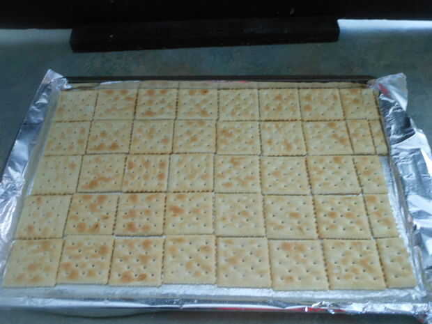 Cubrir la bandeja con galletas de soda, sal lado hacia arriba.  Ponga a un lado.