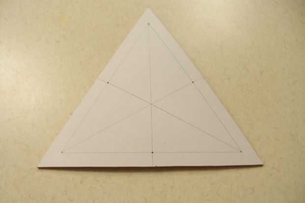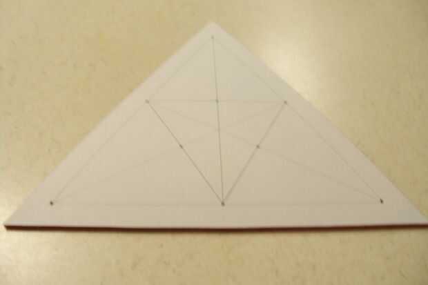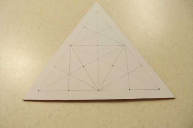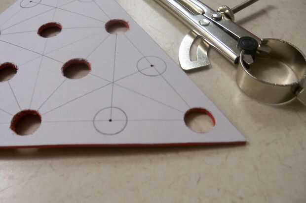 Use su lápiz y transportador trazar un triángulo equiangular con lados de 6 pulgadas. Luego, dividir el triángulo como se muestra en las fotos de abajo, o más simplemente, colocan el 15 peones en un arreglo triangular espaciadas aproximadamente igual. Use la brújula para hacer un pequeño círculo alrededor de cada punto. Recorte el triángulo y dos más exactamente como él.