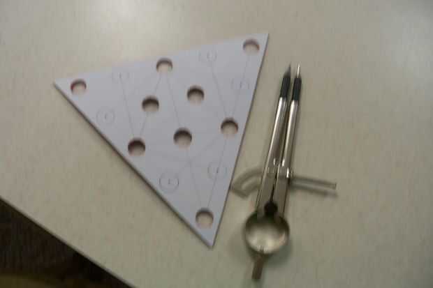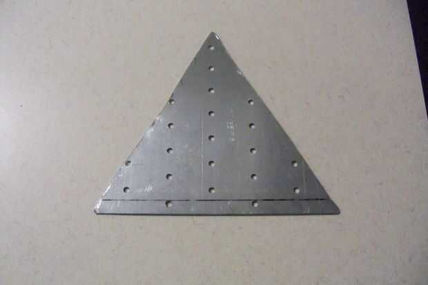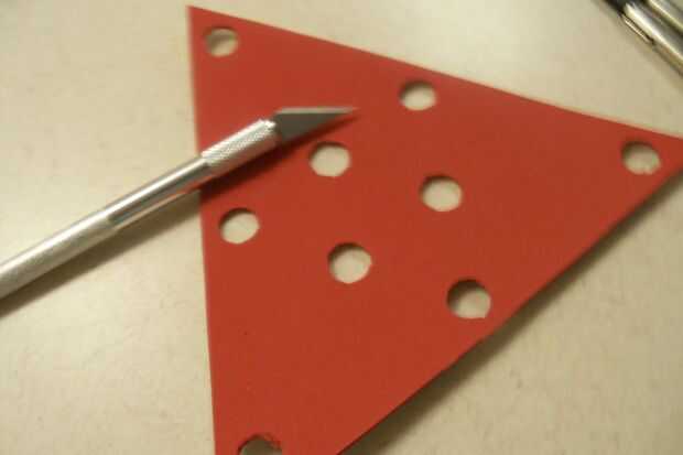 Use su cuchillo x-acto para cortar cada círculo. También cortar un triángulo, un poco más pequeño que el triángulo de espuma, de la chapa.