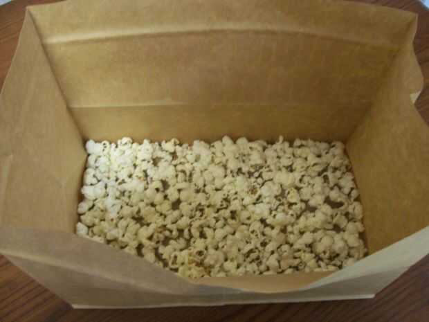 Verter el almíbar caliente sobre el palomitas de maíz/maní y doblar la parte superior de la bolsa de papel. Agite la bolsa para que palomitas de maíz/maní están cubiertas con el almíbar.