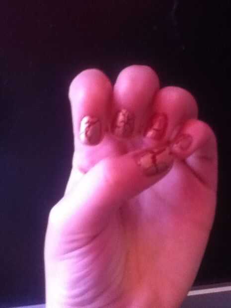 de uñas es divertido! No soy muy bueno en el arte de uñas pero pensé que sería divertido intentar algo que no sea esmalte para uñas. Por lo tanto, utilicé pintura de tela dorada con esmalte de uñas negro. Puede utilizar pintura de brillo también. Mis