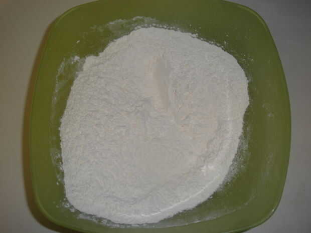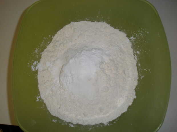 Combinar todos los ingredientes secos (4 c harina, 4 t de polvo de hornear y sal t 1) en un bol y reservar.
