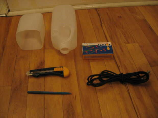 -jugo y leche de vieja 2 botellas (utilicé la clase 1,89 L polietileno). Cuanto mayor sea la botella es el mango, mejor (deja una porción más usable, 'recta'). Aquí, una botella está intacta, una ya cortada.