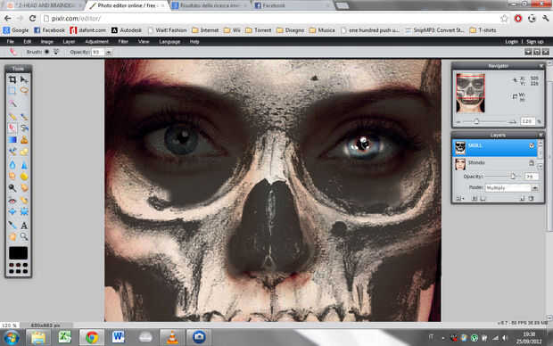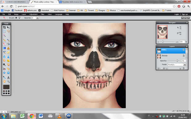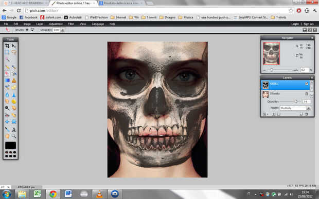 Hay sólo un paso que falta. Debes escoger la herramienta Borrador y borrar las partes de la imagen de cráneo que no quiere ver en la imagen final. Comencé a borrar de los ojos (la parte más importante para borrar) y luego borrar todas las otras partes. Tienes la elección: puede dejar algunos detalles, por ejemplo los dientes, o borrar de la imagen. Lo que quieras, diviértete y disfruta de este proyecto y su resultado final!
