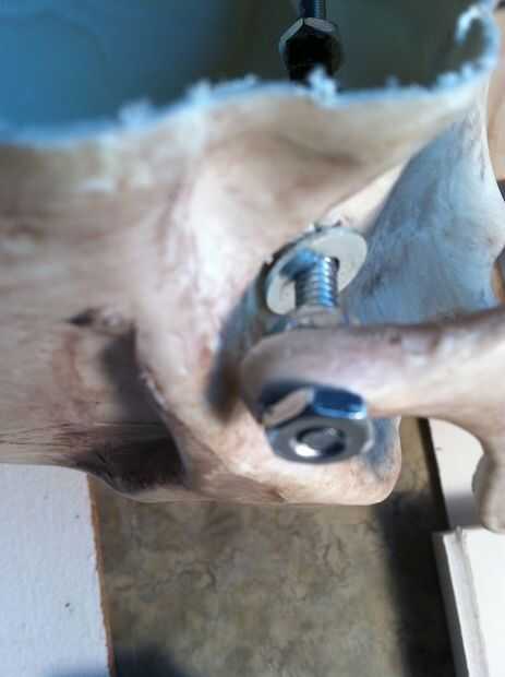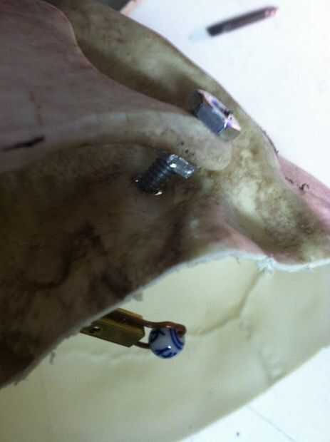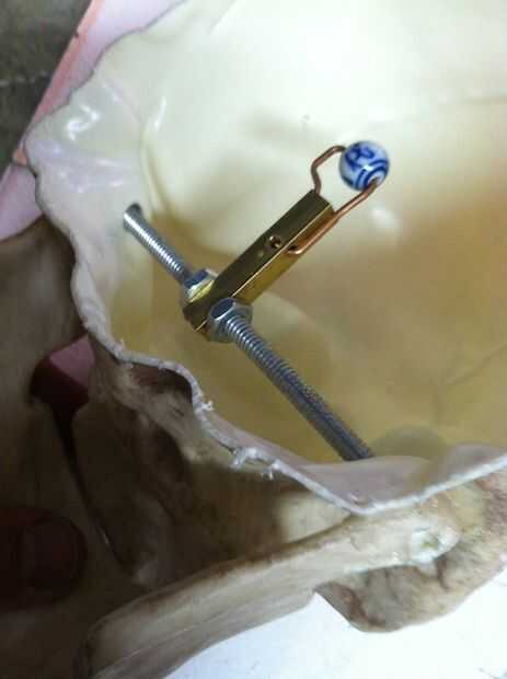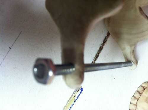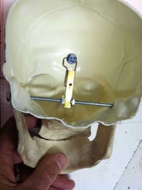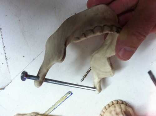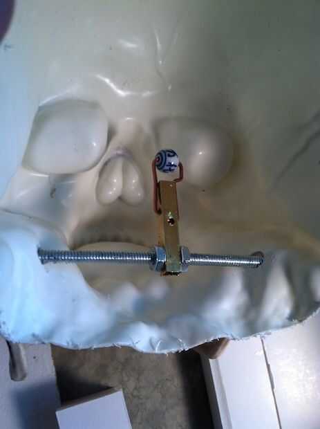 El seguidor de leva tiene un agujero en el extremo del tubo bronce cuadrado lo suficientemente grande para el hilo a través de la varilla roscada de 10-24 entre los lados de la dos mandíbula. El seguidor de leva se traba en la varilla roscada con dos tuercas apretadas contra él. Así, cuando se mueve el seguidor de levas de latón, la mandíbula se mueve demasiado. Tuve que agrandar los orificios en el cráneo para que la varilla roscada se mueve fácilmente.