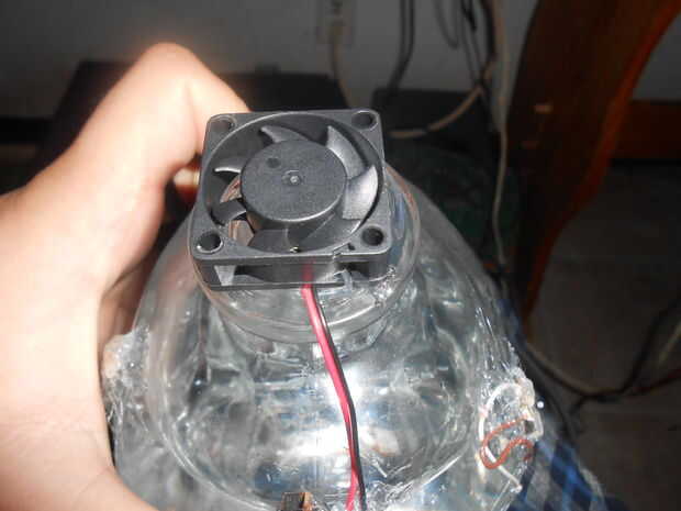 coloqué una sección de rgb en la parte inferior del vidrio y una a cada lado. Había montado el ventilador en la boca de la botella, el circuito de temporizador en la parte posterior del cráneo, la olla en la parte posterior del cráneo y metidos en los cables y caliente pegado en su lugar para asegurarlos. su simple bonito. ver las fotos de cómo hice todo.
