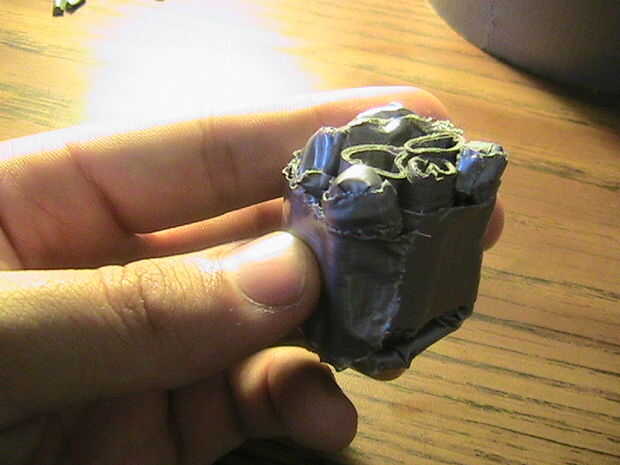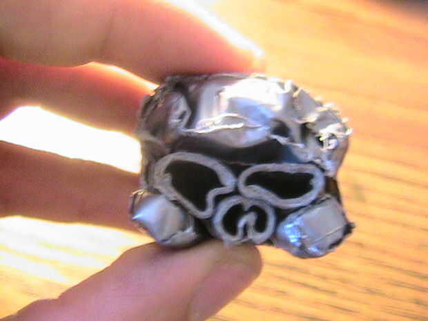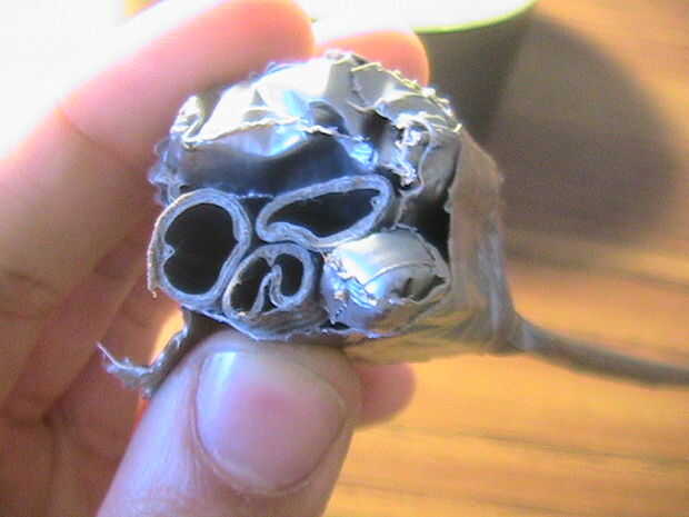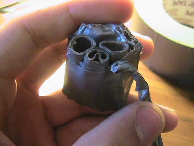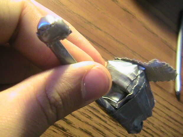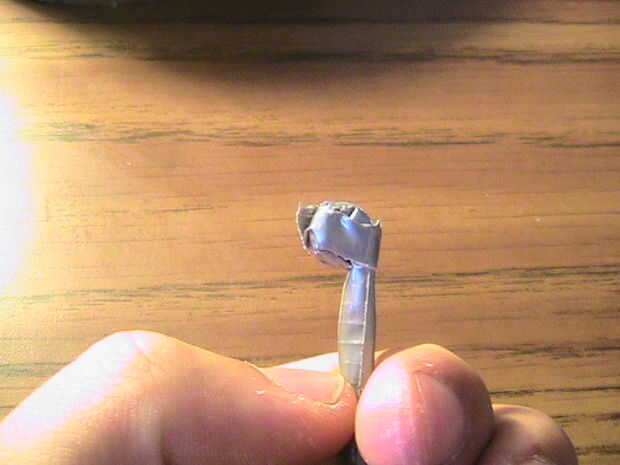Ir a un extremo de esta barra y doblar. Cinta adhesiva en su lugar para formar una pequeña perilla. Coloque esta perilla debajo de uno de los ojos, alineados con la cavidad de la nariz y en su lugar la cinta. Doblar el resto de la tubería alrededor de la parte posterior del cráneo y forma una segunda perilla en el otro extremo para descansar en el otro ojo.