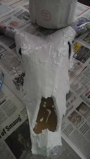 Una vez seco el pegamento que mezclé pollyfilla y procedieron a cubrir la frente y cuernos. I utiliza un cepillo pequeño entonces alisar cráneo principal con papel de lija una vez seco