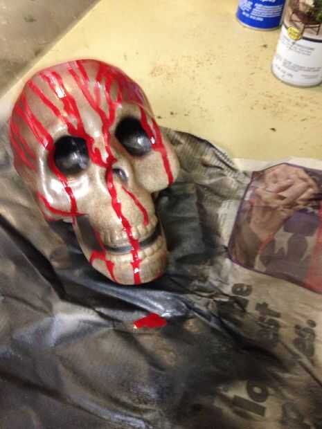 empecé con golpear los cráneos con la pintura negra de lejos por lo que sólo consigue salpicaduras de color. Una vez seco lo mismo con la pintura martillada, pero ponérselo un poco más pesado.