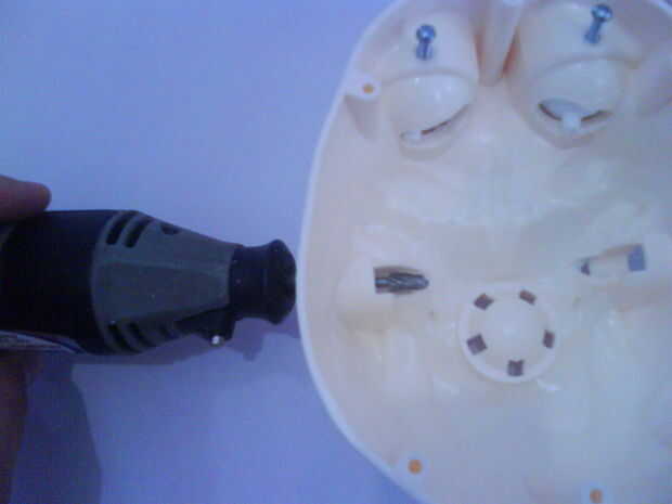 El cable para la mandíbula se hizo siguiendo los pasos de la figura. Colocando la mandíbula en su lugar se encontró que la mordedura no era buena. Por lo tanto, usé un taladro para arreglarlo. Hecho esto, los dientes ajuste derecho junto.