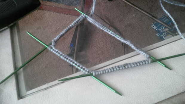 Trabajar 3 hileras de punto de su color de contraste y luego trabajar el patrón de estrella. Habrá 17 repeticiones del patrón de estrella.