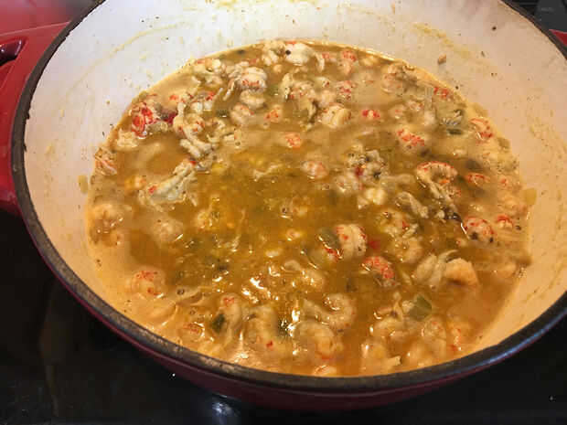 tengo que rendir homenaje a mis raíces de NOLA con este gran etouffee. Normalmente se hace con cigalas o camarones, este platillo puede fácilmente hacerse con pollo para ayudar a reducir el costo. Servir algunos sobre un tazón de arroz caliente con u